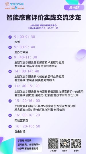 2024年4月19日,食品伙伴網、感知網聯合濟南智感分析儀器有限公司、濟南聯食檢測科技有限公司將在濟南舉辦第九期感官評價實踐交流沙龍。