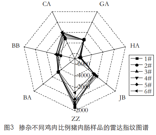 為了更直觀地將不同摻雜雞肉比例的豬肉腸樣品的信號(hào)強(qiáng)度進(jìn)行對(duì)比分析,利用Astree軟件將摻雜不同雞肉比例的豬肉腸樣品在7根不同傳感器下的響應(yīng)強(qiáng)度峰值平均分布在圓周上,并描點(diǎn)成一個(gè)雷達(dá)指紋圖譜,如圖3所示。其中,各樣品編號(hào)的摻雜雞肉比例為:1#.0%,2#.20%,3#.40%,4#.60%,5#.80%,6#.100%。