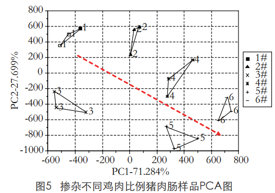 圖5為摻雜不同雞肉比例豬肉腸樣品的主成分分析二維圖。從圖5可見(jiàn)前2個(gè)主成分的貢獻(xiàn)率分別為71.284%、27.699%,累計(jì)貢獻(xiàn)率98.983%,其余主成分貢獻(xiàn)率僅為1.017%,所以取前2個(gè)主成分對(duì)應(yīng)的特征向量所決定的兩維子空間就能夠完全反映樣品的整體數(shù)據(jù)信息。同時(shí),從圖5還可以看出,摻雜不同雞肉比例的豬肉腸樣品分別聚類(lèi)在PCA圖中的不同區(qū)域,所有樣品相互之間能夠較好地區(qū)分,顯著性非常高。聚類(lèi)區(qū)域分布也呈現(xiàn)出一定的規(guī)律性,隨著摻雜雞肉比例的增加,分布區(qū)域總體按圖中標(biāo)注虛線(xiàn)的方向發(fā)展,即朝PC1增加、PC2下降的方向發(fā)展,同時(shí)不同分布區(qū)域的距離并沒(méi)有因?yàn)閾诫s雞肉比例的增加而出現(xiàn)顯著的變化。
