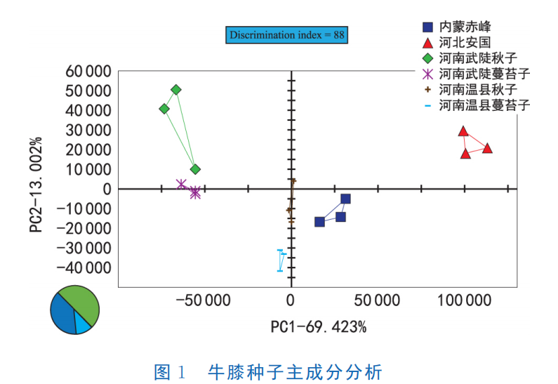 超快速氣相色譜電子鼻已廣泛應用于農業、醫療等領域,在實際生產中電子鼻可用于建立產品質量控制模型,實現對產品品質的快速有效監控,近年來逐漸應用于中藥材的質量評價,在中藥行業中有廣泛的應用前景。本研究通過電子鼻對不同來源牛膝種子的氣味進行檢驗和區分,以期通過該技術客觀描述牛膝種子揮發性化合物的差異,為其鑒別研究提供一定參考。