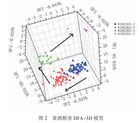 從圖 2 可看出, 醇香評分為 2、3、4、5 分樣品的分布具有明顯規 律 性。圖 中 DF1 占 85.9 %、DF2 占 8.0 %、DF3 占 6.0 %,對于分數為 2 分和 3 分的酒樣與 4 分和 5分的酒樣沿 DF2 和 DF3 呈規律的線性變化,得分為 3 分和 4 分的酒樣沿 DF1 呈規律的線性變化。說明醇香差異由此三因素形成,其中 DF1 為最主要影響因素。