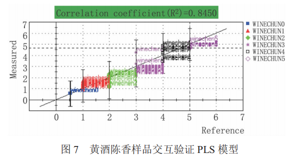 偏最小二乘法(PLS,Partial Least Squares)是通過訓練樣品建立定量模型,在描述定量信息后,選擇適合的傳感器, 可以用來對未知樣品進行定量分析或預測評分的分析方法。實驗中隨機抽取 2、3、4、5 分值的酒樣共計18 份為未知樣品, 然后以其余分值的樣品為基礎建立PLS 定量模型,見圖 3。