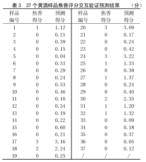 從表 1 可以看出, 所有樣品的醇香得分經交互驗證顯示,驗證準確率為 97.3 %。其中 25 號樣品醇香分值為5 分的酒樣,其預測得分略高,查得此樣品為 40 年陳釀,而 31 號樣品醇香分值為 5 分,預測結果相對接近,查得此樣品為 20 年陳釀。這可能是由于二者年份上的差異加上評分機制最高為 5 分,而導致預測結果略有偏離。在實際感官品評時,不影響其得到最高分值。