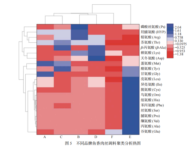 本文利用電子鼻、電子舌和氨基酸檢測(cè)對(duì)不同品牌的魚香肉絲調(diào)料進(jìn)行分析,采用主成分(PCA)、聚類分析、Pearson 相關(guān)系數(shù)和偏最小二乘法(PLS)對(duì)調(diào)料風(fēng)味的差異性進(jìn)行區(qū)分。結(jié)果表明:電子鼻中 12 個(gè)傳感器的響應(yīng)強(qiáng)度差異性明顯,其中碳?xì)浠衔?、芳香類、胺類和氯類差異顯著。PCA 分析法可以有效地區(qū)分不同品牌魚香肉絲調(diào)料的香氣,樣品 B 和 C 的香氣較為相似,其它樣品的香氣差異明顯。
