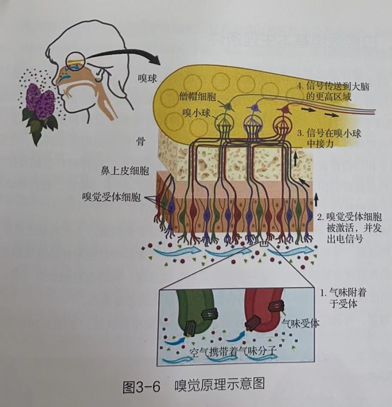 揮發性氣味物質在呼吸作用下進入鼻腔,首先進入嗅感區吸附和溶解在嗅黏膜表面,與嗅腺細胞的分泌物溶在一起,進而擴散至嗅毛,被嗅細胞所感受,嗅細胞表面電荷改變,Na﹢,K﹢等離子跨膜移動產生電流發出電信號,通過傳導神經以脈沖信號的形式傳遞,神經末梢產生興奮信號,經過大腦皮層嗅區信號處理分析后產生嗅覺(圖3-6)。