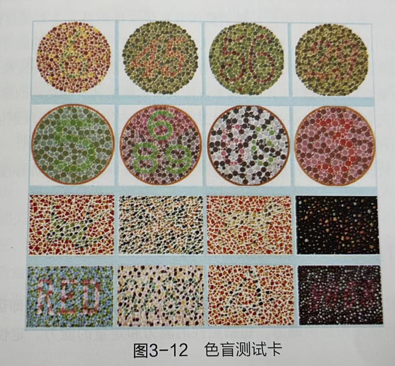 全色盲是色覺障礙中最嚴重的一種,患者喜暗、畏光,表現為晝盲。對于顏色只有明暗之分,而無顏色差別。紅色盲又稱第一色盲,患者主要是不能分辨紅色,對紅色與深綠色、藍色與紫紅色以及紫色不能分辨,常把綠色視為黃色,紫色看成藍色,將綠色和藍色相混視為白色。綠色盲又稱第二色盲,患者不能分辨淡綠色與深紅色、紫色與青藍色、紫紅色與灰色,把綠色視為灰色或暗黑色。臨床上把紅色盲與綠色盲統稱為紅綠色盲,該類患者比較常見。我們平常說的色盲一般就是指紅綠色盲。藍黃色盲又稱第三色盲。患者藍黃色混淆不清,對紅、綠色可辨。實踐中,主要采用色盲測試來初篩評價員的視覺條件,色盲測試采用如圖3-12所示的測試卡形式。