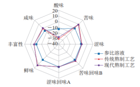 傳統(tǒng)工藝熬制和現(xiàn)代工藝熬制的“佛跳墻”滋味上的差異可以通過(guò)電子舌區(qū)分,二者之間的差異主要表現(xiàn)在苦味和澀味上。