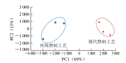 由圖6可知,PC1(69%)與PC2(13%)的累計(jì)貢獻(xiàn)率為82%(>70%),說(shuō)明這兩個(gè)PC能夠代表不同熬制工藝“佛跳墻”中揮發(fā)性物質(zhì)的特征信息。兩種熬制工藝的“佛跳墻”樣品各自聚類,說(shuō)明不同熬制工藝“佛跳墻”樣品的揮發(fā)性風(fēng)味物質(zhì)可明顯區(qū)分。結(jié)論