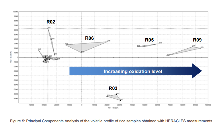 本研究表明,Heracles主成分分析可以在采集完樣品之后直接區分大米的氣味差異,同時此次實驗還成功地用于快速比較幾種大米樣品中2-乙酰基-1-吡咯啉的含量,以及氧化指標(己醛)的含量。