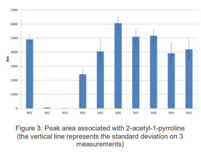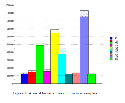 比較其己醛的含量可知大米的氧化水平,比較2-乙酰基-1-吡咯啉含量可知其特征香味在大米中的含量。