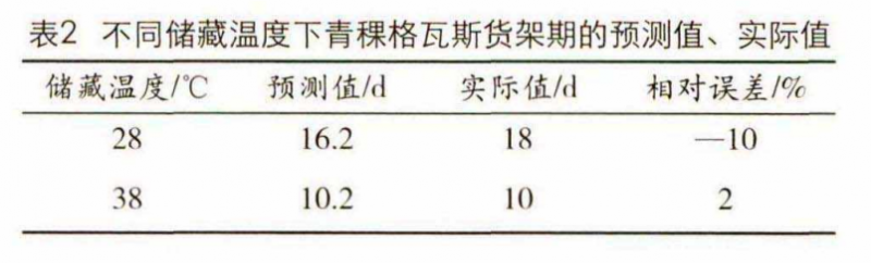 Q10值為溫度相差10 °C時(shí)食品的貨架期之比,該值用來(lái)確定溫度對(duì)反應(yīng)的敏感程度,大多數(shù)據(jù)為2。由表1可知,3種溫度下青棵格瓦斯的貨架期數(shù)據(jù),計(jì)算得Q10為 1.5?2.0,平均值為 1.75。應(yīng)用Origin軟件對(duì)貨架期Y和溫度X的關(guān)系進(jìn)行曲線擬合,發(fā)現(xiàn)Y與X的關(guān)系最符合一次函數(shù),擬合方程為Y=-0.6X+33, R2=1。為驗(yàn)證模型的準(zhǔn)確性 ,實(shí)驗(yàn)選取28、38 °C儲(chǔ)藏,所得格瓦斯的貨架期分別為 18、10 d, 模型預(yù)測(cè)值為16.2、10.2 d,預(yù)測(cè)值的相對(duì)誤差率在-1 0 %?2 % , 誤差較小,說(shuō)明此模型可快速地對(duì)青棵格瓦斯貨架期進(jìn)項(xiàng)初步預(yù)測(cè)。