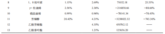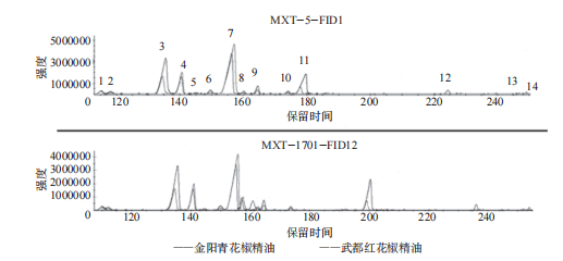花椒作物在我國(guó)很多地區(qū)都有種植,花椒的揮發(fā)油是花椒香氣的主要來(lái)源,也是反映花椒香氣的主要指標(biāo),花椒中揮發(fā)油的含量及組成成分不僅受到花椒品種、產(chǎn)地環(huán)境因子(如產(chǎn)地氣候、雨量、日照時(shí)間、土質(zhì)等)的影響,還受到提取加工方法、提取部位和采收時(shí)期等外在因素的影響。 超快速氣相電子鼻技術(shù)具有分析速度快、靈敏度高和檢測(cè)費(fèi)用低等優(yōu)點(diǎn)。超快速氣相電子鼻將雙快速氣相色譜檢測(cè)與基于多變量統(tǒng)計(jì)的強(qiáng)大數(shù)據(jù)處理和感官及化學(xué)表征(Arochembase)的可選模塊相結(jié)合,利用超快速氣相電子鼻技術(shù),解析不同品種花椒及花椒提取物揮發(fā)性化合物,通過(guò)主成分分析建立產(chǎn)品有效判別模型,同時(shí)解析花椒物質(zhì)構(gòu)成。 不同產(chǎn)地花椒原料、花椒精油產(chǎn)品、花椒油產(chǎn)品、nC6-nC16標(biāo)準(zhǔn)溶液。 超快速氣相電子鼻;零空氣發(fā)生器;氫氣發(fā)生器;20mL頂空進(jìn)樣瓶,電子天平。 花椒:取0.2g花椒顆粒于20mL頂空進(jìn)樣瓶中,迅速加蓋密封檢測(cè),設(shè)置3個(gè)平行樣品,降低檢測(cè)誤差。 花椒精油:將花椒精油搖晃均勻后,取20uL于20mL頂空進(jìn)樣瓶中,加蓋密封檢測(cè),每個(gè)樣品設(shè)置3個(gè)平行樣。 花椒油:將花椒油搖晃均勻后,使用電子天平稱(chēng)取0.1g于20mL頂空進(jìn)樣瓶中,加蓋密封檢測(cè),設(shè)置3個(gè)平行樣品。 花椒原料:樣品量0.2g,進(jìn)樣體積500uL,孵化溫度80℃,孵化時(shí)間20min,50℃恒溫30s,1℃/s速率升溫至80℃恒溫30s,3℃/s速率升溫至125℃恒溫10s,3℃/s速率升溫至250℃恒溫11s。 花椒精油:取樣量100μL,捕集溫度40℃,孵化溫度60℃,孵化時(shí)間10min,載氣流量30mL/min;進(jìn)樣量1000uL,進(jìn)樣口溫度200℃,閥溫度為250℃;FID溫度260℃,升溫程序:初始溫度45℃,保持35s,1.0℃/s升至70℃,保持30s,0.5℃/s升至140℃,3.0℃/s升至250℃,保持21s,采集時(shí)間共計(jì)288s。花椒油:取樣量0.1g,捕集溫度40℃,孵化溫度60℃,孵化時(shí)間20min,載氣流量30mL/min;進(jìn)樣量500uL,進(jìn)樣口溫度200℃,閥溫度為260℃,F(xiàn)ID溫度為260℃,升溫程序:初始溫度50℃,保持30s,1.0℃/s升至85℃,保持30s,1.0℃/s升至125℃,保持10s,3.0℃/s升至250℃,保持10s,采集時(shí)間共計(jì)197s。 將裝有樣品的頂空小瓶按照順序依次放入樣品盤(pán),每3個(gè)平行樣品后面放入一個(gè)空瓶,目的是為了消除樣品帶來(lái)的信號(hào)干擾,選擇程序進(jìn)行樣品分析。 使用Heracles超快速氣相電子鼻自帶軟件Alphasoft進(jìn)行樣品數(shù)據(jù)處理,明確揮發(fā)性風(fēng)味物質(zhì)種類(lèi)與含量。 利用正構(gòu)烷烴標(biāo)準(zhǔn)溶液(nC6-nC16)進(jìn)行校準(zhǔn),進(jìn)行保留時(shí)間與保留參數(shù)之間的轉(zhuǎn)換,利用超快速氣相電子鼻自帶數(shù)據(jù)庫(kù)AroChembase數(shù)據(jù)庫(kù)對(duì)樣品中的成分進(jìn)行定性分析,采用峰面積歸一法對(duì)目標(biāo)化合物進(jìn)行定量分析,確定各香氣成分相對(duì)含量。 采用正構(gòu)烷烴標(biāo)準(zhǔn)溶液(nC6-nC16)對(duì)檢測(cè)方法進(jìn)行校準(zhǔn),結(jié)合超快速氣相電子鼻自帶AroChembase數(shù)據(jù)庫(kù)對(duì)樣品中主要揮發(fā)性成分進(jìn)行定性分析,推測(cè)得到匹配度高的化合物。 通過(guò)對(duì)比色譜圖(圖1)發(fā)現(xiàn),樣品間的出峰時(shí)間及出峰位置基本一致,峰面積間存在差異,說(shuō)明樣品中揮發(fā)性成分的種類(lèi)基本一致,含量上存在略微差異。 圖1 武都紅花椒、金陽(yáng)青花椒原料指紋圖譜 青花椒原料中共分析出11種含量較高成分,紅花椒原料中共分析出13種含量較高成分,乙酸芳樟酯與乙酸香葉酯在青花椒中未曾檢測(cè)出。通過(guò)計(jì)算,可知青、紅花椒不僅成分種類(lèi)上有差異,各成分含量上同樣差異明顯。除1R-(+)-α-蒎烯、1,8桉葉素、乙酸芳樟酯、乙酸香葉酯外,其他成分均是青花椒中含量較紅花椒高。其中,青紅花椒原料中芳樟醇含量差別最大,差異最為明顯,D-檸檬烯含量差別較大,但相對(duì)偏差不大,推斷不是造成青紅花椒風(fēng)味不同的主要差異。乙酸芳樟酯、乙酸香葉酯僅存在于紅花椒原料中,由此可利用花椒原料產(chǎn)品中芳樟醇、乙酸芳樟酯、乙酸香葉酯含量區(qū)分花椒原料種類(lèi)。 表1 武都紅花椒、金陽(yáng)青花椒原料特征化合物相對(duì)含量與峰面積差異 青花椒精油中共分析出11種含量較高成分,紅花椒精油中共分析出13種含量較高成分,乙酸芳樟酯與乙酸香葉酯在青花椒中未曾檢測(cè)出,與原料表現(xiàn)一致。通過(guò)計(jì)算峰面積差值和含量偏差可知,乙酸芳樟酯等酯類(lèi)物質(zhì)僅存在于紅花椒中。1R-(+)-α-蒎烯、月桂烯、D-檸檬烯、1,8桉葉素在紅花椒精油中含量較高,其他組分在青花椒精油中含量較高,和原料情況不一致,可能和提取工藝有關(guān)。其中芳樟醇含量差別最大,差異最為明顯,乙酸芳樟酯、乙酸香葉酯僅存在于紅花椒精油產(chǎn)品中,由此可利用花椒精油產(chǎn)品中檜烯、β-蒎烯、芳樟醇含量和乙酸芳樟酯、乙酸香葉酯等酯類(lèi)物質(zhì)存在與否來(lái)區(qū)分花椒精油種類(lèi)。 圖2 武都紅花椒精油、金陽(yáng)青花椒精油指紋圖譜 表2 武都紅花椒精油、金陽(