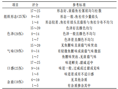 從組織形態、色澤、氣味、口感和雜質5個方面對菌菇魚松進行感官評定,滿分以100分計。由10名具有一定感官評定能力的同學組成評定小組,在室溫(25℃)條件下,參照GB/T23968-2009《肉松》標準適當修改,進行感官評定,見表2。
