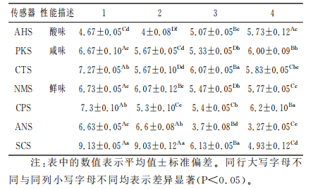 不同菌菇類魚松電子舌傳感器數據的差異性分析見表4,其中AHS是酸味傳感器,PKS是咸味傳感器,NMS是鮮味傳感器,CTS、CPS、ANS和SCS均是廣譜傳感器。對于純魚松來說,電子舌對鮮味和咸味的感應較強,對酸味的感應較弱;對于金針菇魚松樣品,電子舌對鮮味的感應較強,咸味次之,酸味感應較弱;對于杏鮑菇魚松樣品,與純魚松一樣,電子舌對鮮味和咸味的感應較強,對酸味的感應較弱;對于香菇魚松樣品,電子舌對咸味的感應較強,對酸味和鮮味的感應較弱。同時由表4可知,同一傳感器對不同菌菇魚松樣品的感應值不同:其中香菇魚松的酸味感應值最大,杏鮑菇次之,金針菇魚松最小;純魚松的咸味感應值最大,香菇次之,杏鮑菇魚松最小;純魚松的鮮味感應值最大,金針菇次之,杏鮑菇最小,且4種魚松對酸味、鮮味和咸味的感應值之間的差異均顯著。與杏鮑菇魚松和香菇魚松相比,金針菇魚松能夠保持較好的鮮味,且酸味和咸味適中。
