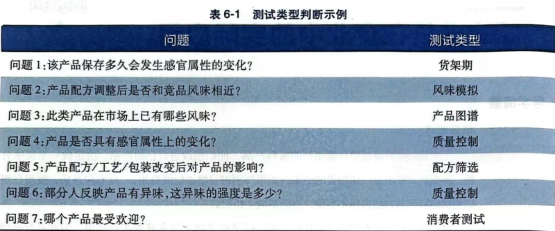 當(dāng)企業(yè)在新產(chǎn)品開發(fā)環(huán)節(jié)中運(yùn)用到感官評價(jià)時(shí),研發(fā)人員以及營銷人員會(huì)針對感官分析師提出很多問題。在企業(yè)運(yùn)用中,我們根據(jù)目的可以將感官評價(jià)分為以下幾類:貨架期、配方篩選、產(chǎn)品圖譜、質(zhì)量控制、風(fēng)味模擬、消費(fèi)者測試,見表6-1。