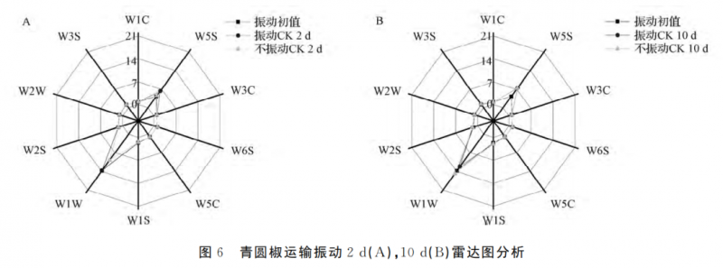 圖10(A)為西蘭花前3d的雷達圖(B 組),前3d西蘭花的氣味變化并不明顯,均接近初值,說明此時的西蘭花新鮮,具有商品價值。4d西蘭花的氣味與 初 值 相 比 明 顯 改 變,2號 和7號 傳感器的響應值變化明顯,此時西蘭花腐爛變質,出現其它氣味,失去商品價值。不振動 CK 組的氣味明顯好于振動 CK 組,說明振動影響西蘭花組織表皮細胞的滲透和細胞壁的降解,并影響運輸后西蘭花的硬度和外部變化,降低商品價值。