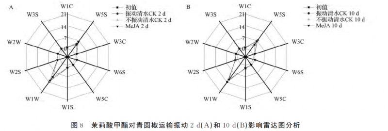 由圖8青圓椒的振動雷達圖可知,青圓椒在相同貯藏天數后,青圓椒振動清水 CK 組、不振動清水 CK 組和振動 MeJA 組(B組)呈現相同的變化,所以雷達圖以2d和10d為例。如圖8(A)和(B)所示,為青圓椒振動清水 CK 組、不振動清水CK 組和振動 MeJA 組在貯藏2d和10d的雷達圖。2號和7號傳感器的響應值均為最大,振動MeJA 組的青圓椒氣味的改變最小,其氣味接 近初值。因此,用 MeJA 處理振動后的青圓椒可以有效延長其貨架期,防止青圓椒的腐敗。