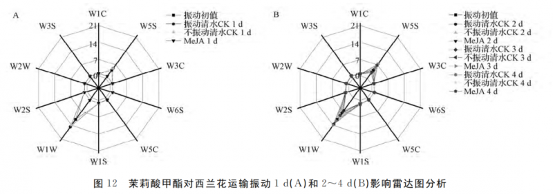 如圖12所示,2號和7號傳感器的響應值變化明顯。圖12(A)所示,貯藏1d時,不振動清水CK 組、振動清水 CK 組和振動 MeJA 組(B組)的西蘭花氣味變化均不大,說明貯藏1d西蘭花新鮮,具有較高的商品價值。MeJA 處理過的西蘭花與振動清水CK和不振動清水CK相比更接近初值,說明,用 MeJA處理振動后的西蘭花可以有效降低西蘭花的損傷,提高其商品價值。圖12(B)所 示,2d后,西蘭花的氣味改變明顯,經過 MeJA 處理后的西蘭花氣味變化較小,因此用 MeJA 處理可以有效抑制振動后的西蘭花氣味變化,延長貨架期。
