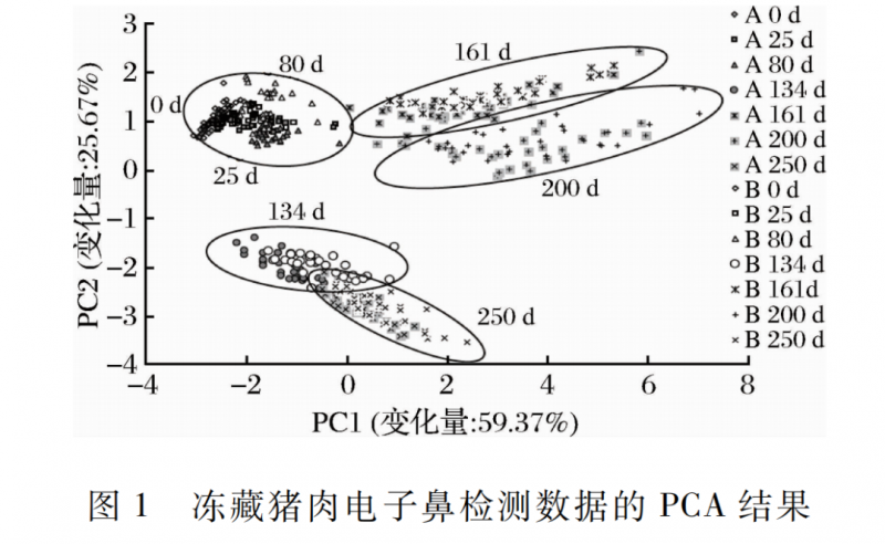 從圖 1中可知,經過 PCA 分析后,除了儲藏 0、25、80d的數據重合外,第 134、161、200、250天數據都能較好區分。而儲藏 0~80d的數據相對集中,這可能是由于在這一時間段內凍藏豬肉的品質劣變不顯著,其風味成分的差異也較小。但是隨著凍藏時間的不斷延長其品質劣變不斷加劇,其風味成分的差異也不斷加劇。這一結果從揮發性風味成分的角度也證明了凍藏豬肉品質發生劣變的時間拐點是在 4 個月左右,而在已有的凍藏豬肉品質變化的研究中也得出了相似的結果。