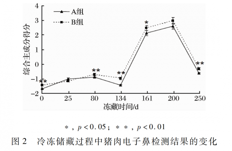 從圖 2可見,在第 0,80,134,161,250天時 A,B兩組間檢測結果差異顯著,而第 25 和 200 天時 A,B兩組間檢測結果差異不顯著(p>0.05)。這表明經過 7d冷藏后再凍藏的豬肉與新鮮凍藏的豬肉相比可能已經發生了變化,但在凍藏過程中發生劣變可能又掩蓋了其本身的差異,但隨著凍藏時間的增加其氣味成分的差異又逐漸加大。盡管 200d 時的差異也不顯著,則是可能是由于組內變異過大掩蓋了組間差異造成的,其平均值之間的差異仍在增大。