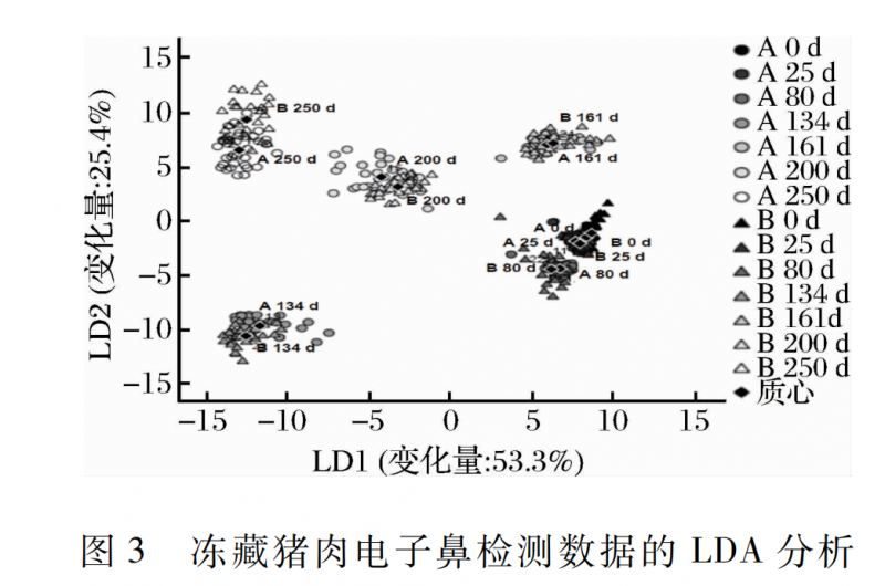 為建立相應的預測模型,采用 LDA方法對數據進一步分析。LDA一種常用的分類方法,立足與找到反映兩類物體或事件特征的一個線性組合,以特征化或區分不同的樣本集。對冷凍儲藏 0、25、80、134、161、200、250d共 420 個豬肉樣品數據按照分組方式和凍藏時間分為 14 個類別進行 LDA分析,結果如圖 3所 示。用 于 作 圖 的 判 別 函 數 其 總 貢 獻 率 為 78.7%,其中第一判別函數貢獻率為 53.3%,第二判別函數貢獻率為 25.4%。由圖 3可知,經過 LDA分析后,除了凍藏第 0 和 25 d的數據重合度較高外,其余第 80~250d的數據都能較好區分,說明在凍藏 1個月內豬肉樣品的劣變幾乎沒有發生,但隨著凍藏時間的增加凍藏豬肉的變化越來越顯著。同時在第134,161,200和 250d處 A、B組樣品的組質心分離明顯,與主成分得分的非參檢驗結果類似。