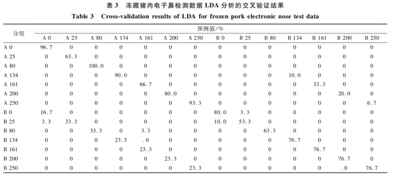 為評估 LDA對豬肉凍藏時間和凍藏前是否經過長時間冷藏的鑒別能力,采用“留一法”對樣品進行交叉驗證,結果見表 3。結果表明對這 14 類樣品的交叉驗證的正確率為 78.1%,值得注意的是即使發生錯判的樣品也主要是在相同凍藏時間點的 A、B兩組之間,如僅以凍藏時間分組其交叉驗證的正確率高達 95.6%。這表明利用 LDA對豬肉凍藏時間和凍藏前是否經過長時間冷藏均具有較好的鑒定能力。