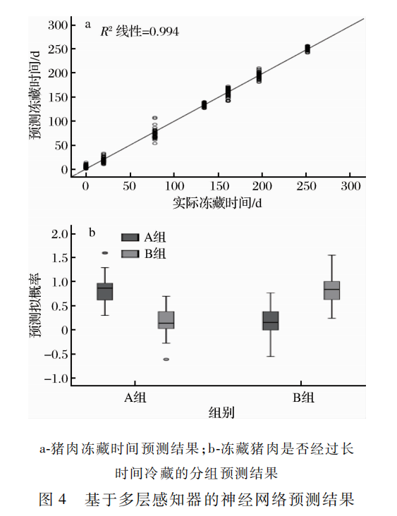 為建立更好的豬肉凍藏時間及凍藏前冷藏時間的預測模型,采用基于多層感知器的人工神經網絡算法對數據進行進一步分析。ANN是一種模仿生物神經網絡(動物的中樞神經系統,特別是大腦)的結構和功能的數學模型或計算模型,目前已被廣范的應用于多元數據的估計或預測。在 處 理 中 將 420 個樣品利用隨機函數分 為 3組,其中訓練樣品 219 個,測試樣品 132 個,支持樣品 69 個。最終生成包含 10個協變量(即電子鼻 10 個傳感器的數據)的輸入層,1 個含有 11 個單元的隱藏層和包含凍藏時間和 A,B組分類的輸出層。該模型對支持組數據的凍藏時間預測的相對錯誤僅為 0.008 ,對凍藏前是否經過長時間冷藏的分組錯誤率僅 7.2%(即預測正確率為 92.8%,由于支持組數據不參與建模,其給出的誤差可比較真實的反映模型的預測能力。)模型對冷凍儲藏時間和凍藏前是 否經過長時間冷藏的預測結果見圖 4。從圖 4中可知,該模型對豬肉凍藏時間和 凍藏前是否經過長時間冷藏均有較好的預測能力。由于 ANN生成的預測模型對凍藏時間生產的是一個回歸模型具有更大的預測范圍,而對凍藏前是否經過長時間冷藏的分組也有更高的準確率,因該 ANN模型與 LDA模型相比具有更好的預測性能。