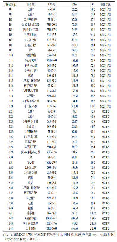 Heracles II GC-E-Nose采用氣相色譜原理,采用RI結合AroChembase數據庫對化合物進行鑒定,共定性出36個化合物,主要包括醛類8個、烯烴類6個、酯類5個、酮類4個、醇類3個、雜環類物質3個、硫化物2個、酸類2個、烷烴類2個和芳烴類1個。乙醇、乙醛、二甲基硫醚、乙酸乙酯、苯、二甲基二硫化物、異丁酸乙酯、3-己酮8個揮發性香氣化合物在2根色譜柱中同時檢出。綜上所述,兩組紅茶樣本采用GC-E-Nose技術得到1個44維的數據集用以表征其香氣品質(表2)。