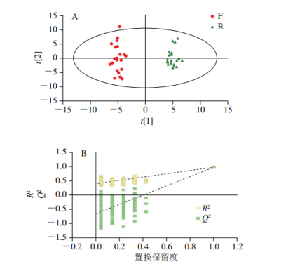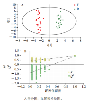 OPLS-DA以GC-MS鑒定的73種揮發性成分相對含量數據集為基礎,建立了工夫紅茶香氣品質分類OPLS-DA模型,結果如圖2C所示,缺陷紅茶樣品與優質紅茶樣品分別位于X軸的負半軸和正半軸,兩組間分離明顯(R2Y=0.951,Q2=0.930),存在可視化的差異,與GC-E-Nose模型結果較好地吻合。置換檢驗結果顯示,R2=0.356,Q2=-0.582(圖2D),回歸直線Q2與Y軸的截距小于0,表明模型未過擬合。該結果說明GC-MS結合多元統計分析可以實現缺陷紅茶和優質紅茶的準確分類。