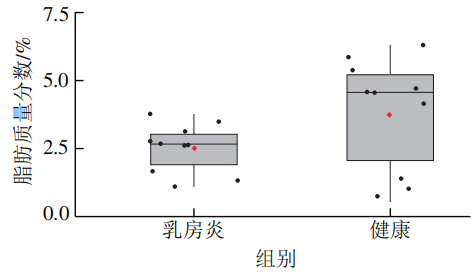 如表1和圖1所示,脂肪質量分數、密度、蛋白質量分數、冰點4 個指標P值均小于0.05,具有顯著差異,與健康組相比,乳房炎組牛乳脂肪質量分數顯著降低(P<0.05)。脂肪在體細胞數量較多的牛乳中顯著下降,可能是由于乳房發炎期間乳腺細胞合成和分泌能力下降。乳房炎牛乳中蛋白質含量增加,可能是由于奶牛患乳房炎后會增加乳房毛細血管的通透性,從而使蛋白含量增加。其余指標在兩種牛乳間差異不顯著(P>0.05)。