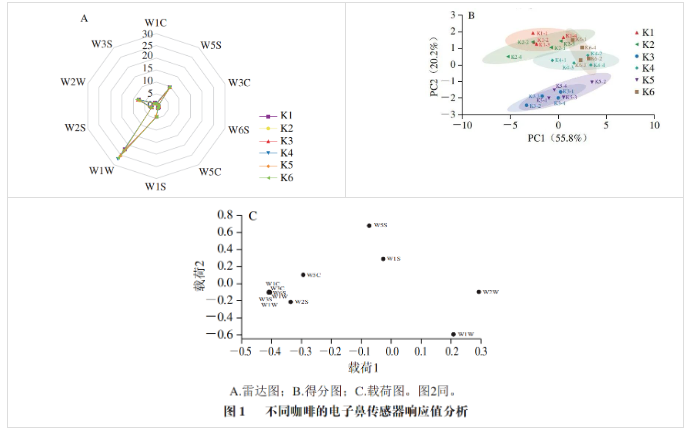 02 不同咖啡的滋味輪廓分析利用電子舌快速分析滋味輪廓,如圖2A所示。6種樣品的雷達(dá)圖輪廓類似,只有酸味傳感器的響應(yīng)值為負(fù),說明酸味對咖啡整體滋味的貢獻(xiàn)較小。各樣品在鮮味與咸味傳感器上的響應(yīng)值差異最大,表明這兩種傳感器對滋味特征的區(qū)分效果最好。為根據(jù)滋味特征進(jìn)一步區(qū)分6種咖啡,對電子舌傳感器響應(yīng)值結(jié)果進(jìn)行PCA(圖2B)。6種咖啡輪廓未重疊,滋味特征明顯,易被區(qū)分。K3、K5和K6咖啡在PC1的正方向,主要受鮮味、咸味、厚味影響;K1、K2和K4咖啡在PC1的負(fù)方向,主要由澀味、酸味、苦味影響(圖2C)。每個樣品聚類的距離與滋味特征接近度相關(guān),有相同咖啡配比的K1~K4樣品,烘焙程度不同,距離較遠(yuǎn),說明電子舌可以區(qū)分不同烘焙度的咖啡。K5、K6咖啡分別與K1、K3咖啡輪廓接近,說明不同的咖啡配比在一定程度上能夠彌補(bǔ)烘焙程度的差異,使不同烘焙度的咖啡具有類似的滋味輪廓。