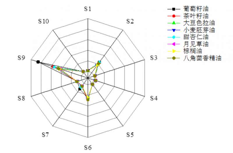 摻入植物油后的摻假八角精油樣品在色澤方面無顯著差異。下圖為純八角精油和摻假八角精油的雷達指紋圖譜,從圖中可以看出植物油摻假的八角精油和純八角精油之間的差異主要體現在S9號傳感器和S7號傳感器上,表明八角精油摻入植物油主要改變了其芳香類氣味,使其氣味體系發生了較大的變化。
