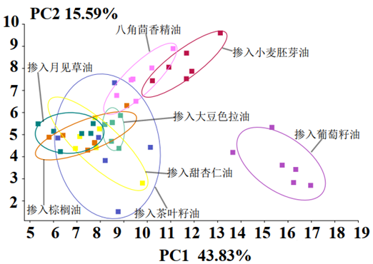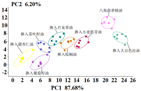 可見,應用電子鼻結合PCA分析對摻入不同植物油的八角精油進行鑒定,能夠很好地區分鑒別摻入不同的植物油(葡萄籽油、茶葉籽油、大豆色拉油、小麥胚芽油、甜杏仁油、月見草油和棕櫚油)。