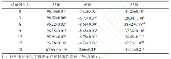 漿水青稞奶茶貯藏過程中色澤變化情況可通過L*值、a*值、b*值來衡量,L*值表示亮度,a*值表示紅綠度,b*值表示黃藍度。漿水青稞奶茶4℃貯藏過程中色度變化如表2所示。