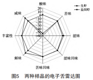 生蝦和鹽焗蝦的電子舌雷達圖如圖1所示,兩種樣品的味道特征不同。在酸味方面,生蝦遠高于鹽焗蝦;在苦味、澀味和澀味回味方面,生蝦略高于鹽焗蝦;而在鮮味和咸味方面,鹽焗蝦明顯超出了生蝦。咸味是由于鹽的存在,而鮮味則可能是因為高溫的處理使得蛋白質與多肽的分解,從而積累鮮味氨基酸如谷氨酸、賴氨酸和甜味的氨基酸如絲氨酸、蘇氨酸、甘氨酸、丙氨酸和賴氨酸,因此這兩方面的味道非常突出,但也缺失了一些豐富性。