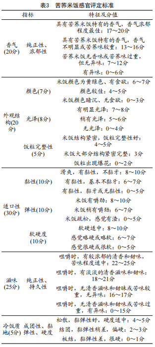 邀請10位具有感官品評經驗的人員,對苦蕎米飯進行感官評價,評分細則見表3。
