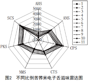 通過味覺分析比較發現不同比例苦蕎米飯的滋味呈現一定的規律性,隨著苦蕎米添加量的增大,各傳感器的響應值也隨之增大。上述結果表明,不同比例的苦蕎米飯滋味會因苦蕎米添加量的不同而逐漸變化。這一結果表明,不同比例的苦蕎米飯滋味會因苦蕎米添加量的不同而逐漸變化。