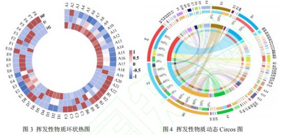 聚類熱圖與動態(tài)Circos圖都可以結合大量數據,以漸進色帶和對應顏色標簽的占比形式共同將檢測得到的各揮發(fā)性化合物與三組樣品的相關性直觀的展現出來。結合圖3、圖4分析可知,在HS樣品中醇類(A)物質相對含量及種類較多,其中包括芳樟醇(A4)、2-壬醇(A5)和2-十二烷醇(A12)等物質。FJ樣品中酮類(E)物質相對含量與種類相較另外兩組樣品較多,主要包括:2-壬酮(E3)、2-十一酮(E4)等物質。WF樣品中醛類(B)與酸類(C)物質占據主導,其中芳樟醇(A4)、苯乙醛(B3)等物質為濃汁本身提供了堅果香氣與櫻桃香氣,并且酸類在其發(fā)酵過程中為其他風味物質的形成提供了前體物質。這一結果與表1及PCA分析一致。