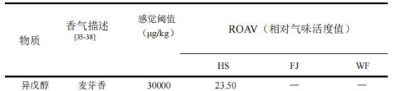 本實驗通過對HS、FJ和WF樣品中的揮發(fā)性化合物進行檢測,共檢測出揮發(fā)性化合物57種,其中醇類22種、醛類6種、酸類4種、酯類8種、酮類9種、其他類8種。對3組樣品中揮發(fā)性化合物相對含量與種類進行PCA分析與聚類分析發(fā)現,HS組揮發(fā)性化合物數量較多,其中主要物質為芳樟醇、2-壬醇和2-十二烷醇等物質;FJ組主要揮發(fā)性化合物為2-壬酮、2-十一酮等物質;WF組揮發(fā)性化合物種類豐富,其中酸類物質與醛類物質占據主導,為后續(xù)風味物質的形成奠定了基礎。通過ROAV值大小對濃汁發(fā)酵前后關鍵風味物質進行判定,發(fā)現HS與FJ樣品中關鍵風味物質種類幾乎一樣,分別為14種和13種;反觀WF樣品中關鍵風味物質種類較少,僅有7種,這說明經過發(fā)酵后的馬鈴薯濃汁在關鍵風味物質方面具有顯著性改善。