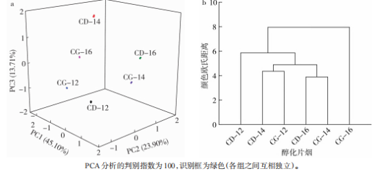 對樣品的電子眼數(shù)據(jù)進行PCA分析,結(jié)果如圖2a所示。可以看出,主成分1(PC1)、主成分2(PC2)和主成分3(PC3)之和達到了82.71%,可代表樣品的絕大部分信息。同時,判別指數(shù)是用來表征樣品之間區(qū)分度大小的一種判斷方法。本實驗中煙葉顏色的判別指數(shù)(評價選定目標的判別質(zhì)量)為100,說明通過電子眼能有效區(qū)分不同包裝樣品的顏色差異,且存在一定可靠性。另外,不同樣品各自聚在一起,說明在不同包裝和醇化時間下樣品顏色分布均存在明顯差異。基于歐氏距離可以判斷不同處理間樣品差異程度。圖2b中CD-12、CD-14、CD-16、CG-12和CG-14處理聚為一組,說明其顏色存在一定相似性;而CG-16處理與其他處理距離最遠,說明其顏色與其他樣品差異最大。故從煙葉顏色看,充氮包裝處理在一定程度上延緩了醇化過程煙葉顏色的褐變加深。