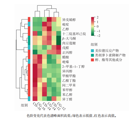 為確定差異揮發(fā)性化合物對醇化片煙氣味的貢獻程度,篩選出的主要差異化合物進行ROAV分析,采用面積歸一化法計算化合物的相對含量,采用AroChembase數(shù)據(jù)庫和文獻中檢索到的化合物氣味閾值為嗅覺閾值。18種主要差異化合物中,β-大馬酮的相對含量較高,且嗅覺閾值較低,因此定義CG-14中的β-大馬酮(相對含量最高)的ROAV值為100。