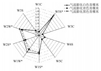 青稞的加工方式多樣,氣流膨化可以使谷物中的水分汽化,谷物組織因劇烈爆破伸展,最終造成組織結構和理化性質的改變,在保持食品品質方面優于傳統膨化方法。本研究采用氣流膨化工藝,以白、青、黑3種色澤青稞膨化米為研究對象,采用電子鼻、電子舌、電子眼、質構儀等設備對其風味特征進行比較。